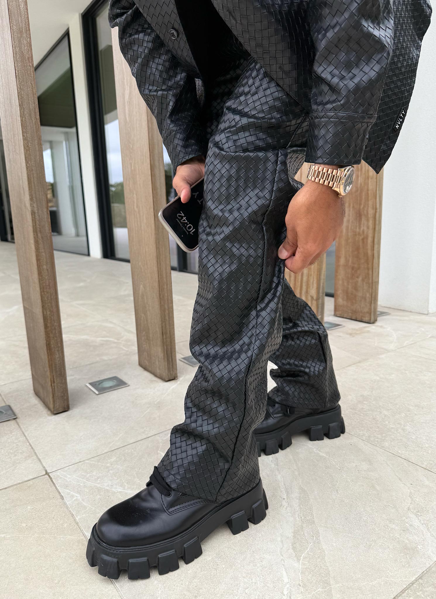 Featuring a premium leather fabric, hand-made and tailored for a high-quality finish. The Leather Interlock Pants have a relaxed upper, which tailors down towards the ankle. The perfect standout piece for a fit.